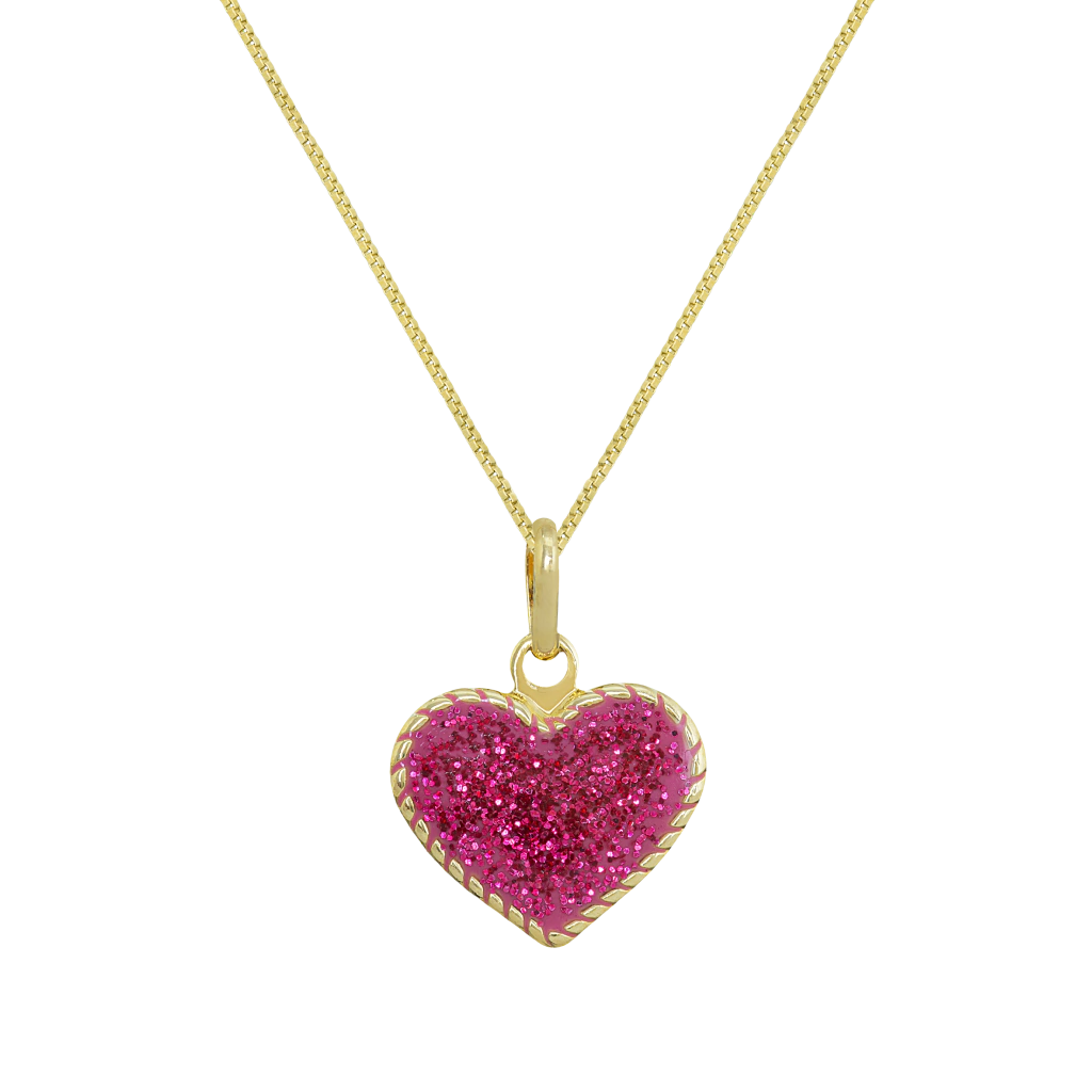 Surpreenda com um toque de amor e brilho! O colar infantil coração resinado com glitter banhado a ouro é o presente perfeito para encantar as pequenas com muita fofura.