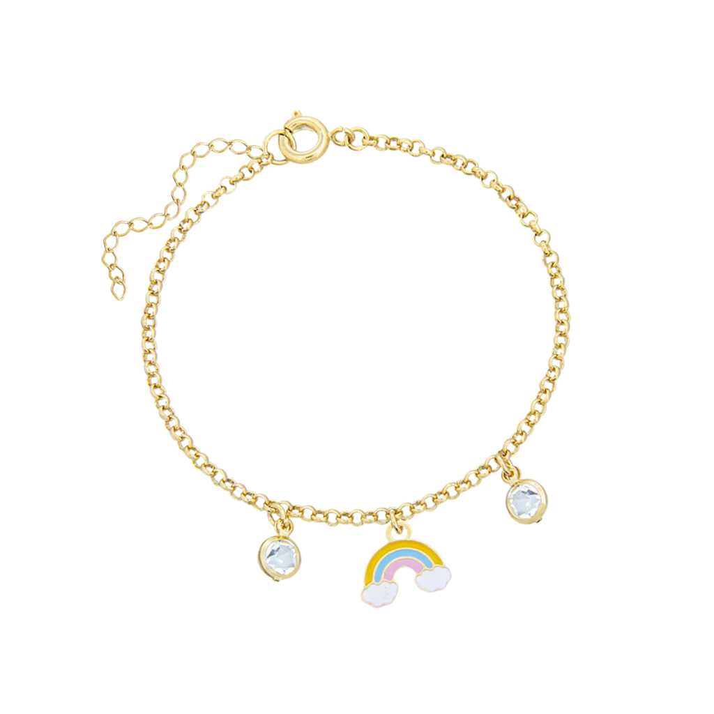 Pulseira Arco Iris com duas pedrinhas nas laterais. Semijoia banhada á ouro 18k revestida com uma camada exclusiva de verniz antialérgico.
